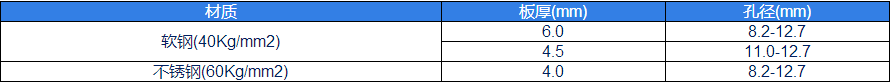 材質(zhì)板厚(mm)孔徑(mm)軟鋼(40Kg/mm2)6.08.2-12.74.511.0-12.7不銹鋼(60Kg/mm2)4.08.2-12.7