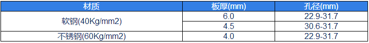 材質(zhì)板厚(mm)孔徑(mm)軟鋼(40Kg/mm2)6.022.9-31.74.530.6-31.7不銹鋼(60Kg/mm2)4.022.9-31.7